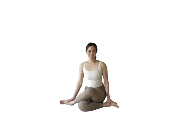 A woman practicing yoga seated on a mat in a spacious room with white wainscoting and a beige wall. She is smiling, wearing a white tank top and beige leggings, with a small potted plant on a white pedestal nearby.